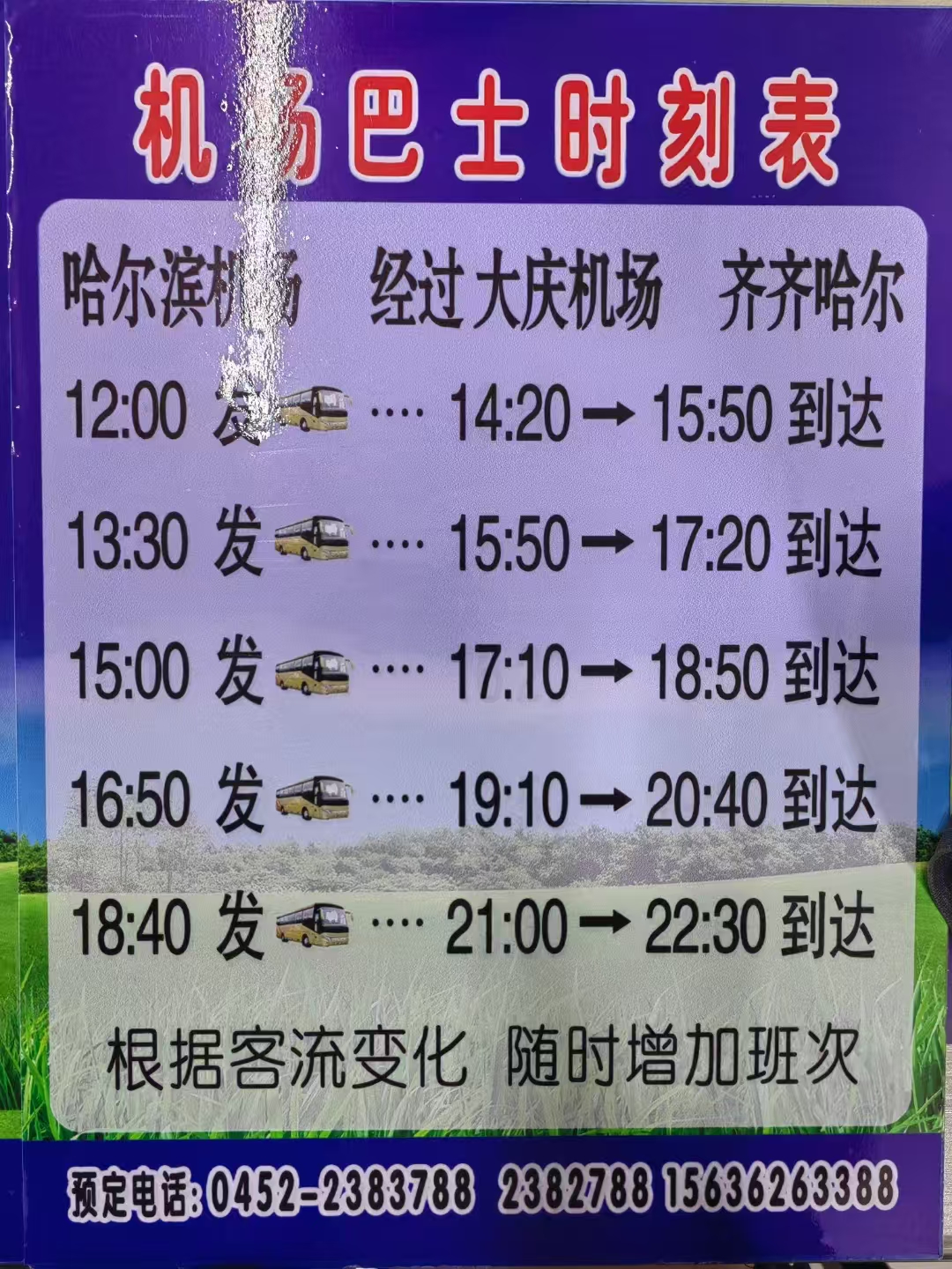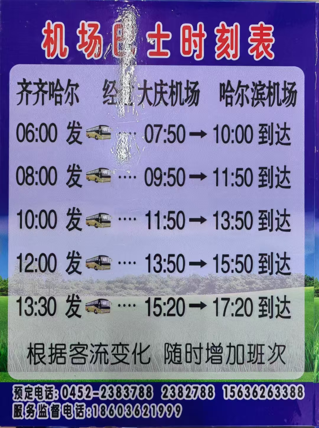 黑龍江天成運(yùn)業(yè)集團(tuán)齊齊哈爾客運(yùn)有限公司齊齊哈爾至哈爾濱機(jī)場巴士于2009年開通,巴士開通以來秉持“安全第一、服務(wù)至上”原則,真心臻誠、專業(yè)服務(wù),每年運(yùn)送旅客20萬人次。機(jī)場巴士配置12米35座大型高一級商務(wù)客車,全承載車身、氣囊懸掛,安全舒適、便捷直達(dá)。專業(yè)駕駛隊(duì)伍、優(yōu)中選優(yōu),保證安全。巴士應(yīng)急全程與交警、交通、機(jī)場聯(lián)動(dòng),迂特殊天氣、特殊路況,應(yīng)急準(zhǔn)備充分、措施得當(dāng)、擔(dān)當(dāng)負(fù)責(zé),確保旅客利益不受傷害。機(jī)場巴士免費(fèi)提供代辦登機(jī)牌、代送衣物、兒童陪伴、老人看護(hù)、賓館預(yù)定服務(wù),隨身行李免費(fèi),提前退票、改簽免費(fèi),夏季礦泉水免費(fèi),當(dāng)日客票全天乘車有效,電話問詢即可訂票,人性化服務(wù)讓您感到溫暖舒心。